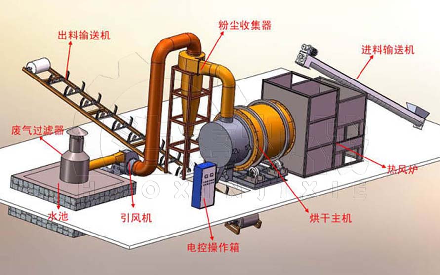 碳化硅先經(jīng)過(guò)鏟車鏟進(jìn)給料機(jī),再由給料機(jī)均勻的送入到皮帶輸送機(jī)上,之后通過(guò)導(dǎo)料管進(jìn)入到烘干機(jī)內(nèi)部,熱風(fēng)爐內(nèi)燃料的燃燒產(chǎn)生的熱量在抽風(fēng)機(jī)的作用下進(jìn)入到主機(jī)內(nèi)與碳化硅進(jìn)行接觸,碳化硅在干燥滾筒內(nèi)均布的抄板翻動(dòng)下,進(jìn)行均勻分散與熱空氣充分接觸,加快了碳化硅烘干傳熱、傳質(zhì),蒸發(fā)水分。我公司生產(chǎn)的碳化硅烘干機(jī)是密封結(jié)構(gòu),能夠很好的降低熱量的散失,提高熱效率。干燥之后的碳化硅經(jīng)過(guò)卸料斗排出被輸送到指定地點(diǎn)進(jìn)行儲(chǔ)存。在卸料斗的上部是排放工藝流程之中的塵土等,經(jīng)過(guò)除塵系統(tǒng)處理之后,能夠很好的達(dá)到環(huán)保的目的。
