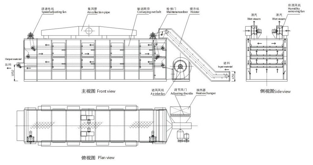 網(wǎng)帶烘干機(jī)利用強(qiáng)制通風(fēng)作用,箱內(nèi)設(shè)有可調(diào)式分風(fēng)板,物料干燥均勻。