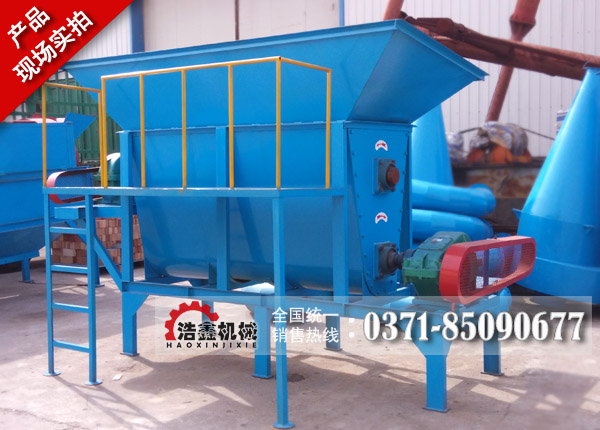 物料經鏟車或輸送設備運輸喂入打散喂料倉,小團塊物料直接進入下部旋切腔,大塊物料經料倉上部耙式裝置打散成一定尺寸的小團塊后進入下部旋切裝置,后在旋切葉片的攪拌、撕裂,擠壓作用下被切割成較薄的片狀后,由出料口排出機外。