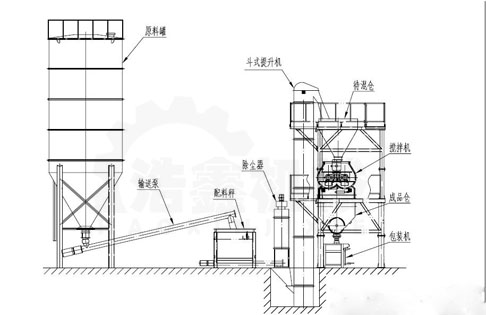 膩?zhàn)臃鄢商自O(shè)備是將雙飛粉、石膏粉、羧甲基纖維粉、緩凝劑、增稠劑等原料混合成膩?zhàn)臃鄣膶I(yè)生產(chǎn)設(shè)備,主要由攪拌機(jī)系統(tǒng)、除塵系統(tǒng)、包裝系統(tǒng)、提升系統(tǒng)組成。